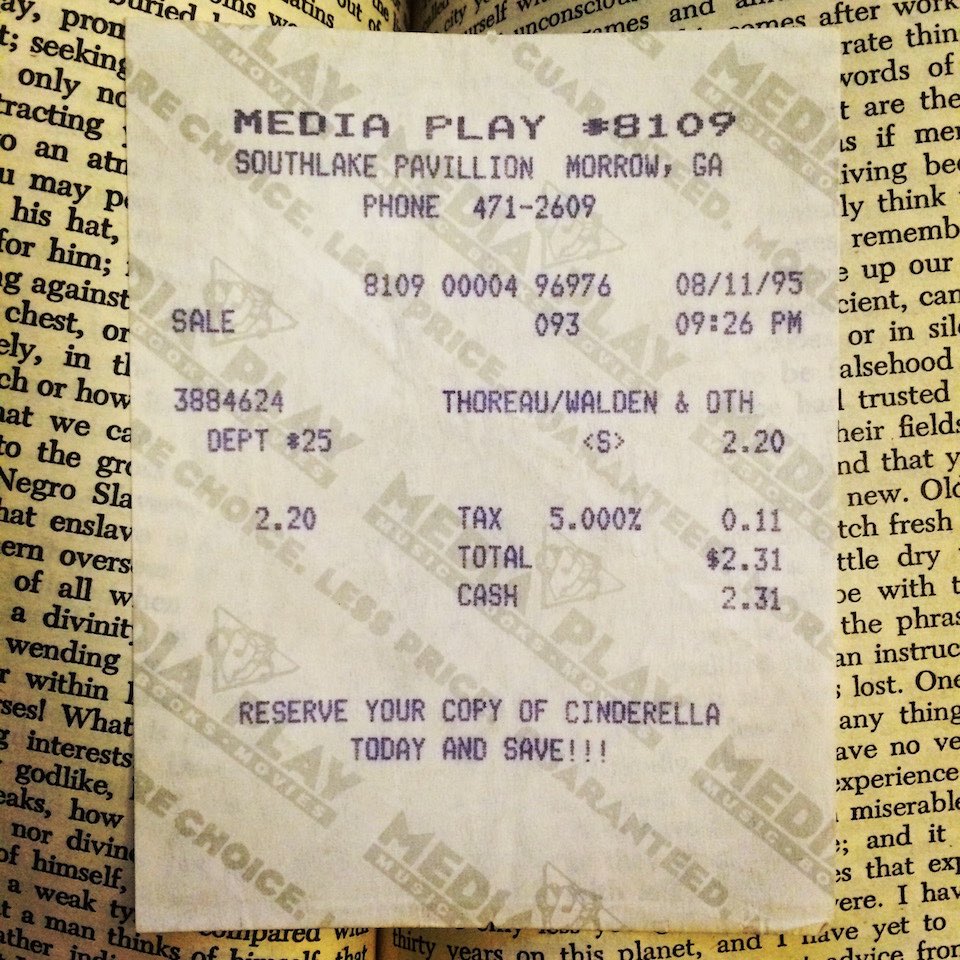 I'm surprised my copy of Walden is nearly 20 years old now. I bought it for a couple dollars at the now-defunct Media Play in Morrow, whose phone number didn't need to include an area code, with 5% sales tax. The receipt is printed on a dot matrix. For some reason I actually had $2.31 in cash too.
